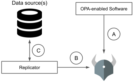Depending on the replication scheme, B and C could be tied together so that every update the data replicator gets from the source of truth it pushes into OPA, but in general those could be decoupled depending on the desired network load, the changes in the data, and so on.