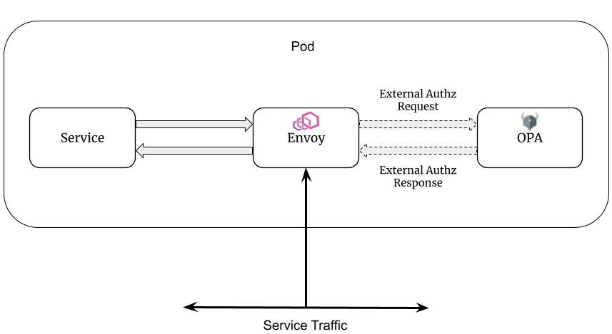 In addition to the Envoy sidecar, your application pods will include an OPA-Envoy sidecar. When Envoy receives API requests destined for your microservice, it checks with OPA to decide if the request should be allowed.